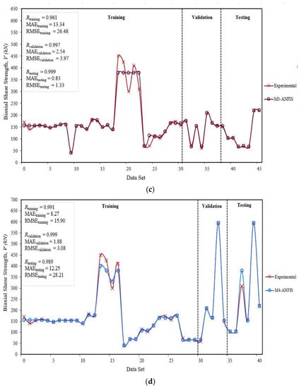 Comparison between experimental and various ANFIS models results: (a) M1-ANFIS vs. experimental results, (b) M2-ANFIS vs. experimental results, (c) M3-ANFIS vs. experimental results, (d) M4-ANFIS vs. experimental results.