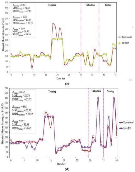 A comparison of the training, validation, and testing sets of the experimental data with the MEP models is provided in Figure 5. The datasets used in the ANFIS modeling were used for MEP modeling. The values of the statistical parameters are also shown for the three datasets of each model. From the figure and the analysis of the statistical parameters, we can note that the M1-MEP model exhibited the highest accuracy of all the models as the value of R was very close to 1, while the values of other parameters were low in comparison to other models. M3- and M4-MEP also exhibit excellent correlation for training, validation, and testing datasets; however, the values of other indicators such as MAE and RMSE were very high. Hence, a higher value of the correlation coefficient does not ensure that a model is good. A combination of different statistical indicators is recommended to check the performance of a model, as discussed above.