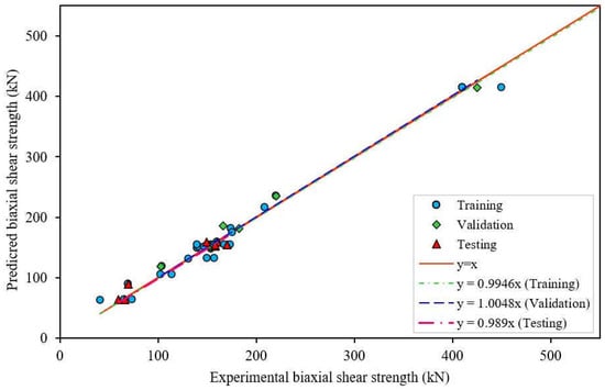 Generally, GEP or ANN are utilized for machine-learning-based modelling in the realm of civil engineering [13,25,26,27,28,29,30,31,32,33]. The obvious advantages of MEP and ANFIS over other EA’s and ANNs would result in the development of accurate models. They have been utilized in a very few studies to predict the mechanical properties of concrete, classify soils, constitutive models for the deformation modulus of soil, design models for columns, and the uplift capacity of suction caissons [16,34,35,36,37]. Due to their ability to create accurate models when the complexity of target expression is unknown (common phenomena in the field of structural engineering) and the ability to search in wider space to predict the output, they can be used to model complex structural behavior. In this study, MEP and ANFIS were utilized to develop models for predicting the shear strength of biaxial-loaded columns. The efficacy of the developed models was assessed based on a rigorous statistical analysis. These studies also ensured that the models apprehended the underlying physical phenomena of the problem in hand. Moreover, a comparative study was performed based on the published experimental and modelling results to verify the universality of the proposed models.