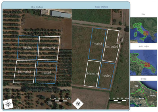 The field trials were performed in Olea europea L. and Vitis vinifera L. orchards in Ostuni and Carovigno in Brindisi province (Figure 2). In both cases, the field trial was divided into four experimental plots, each of 2000 m2, two of which were treated with vegetables and brown algae extract (Ascophyllum nodosum (L.) Le Jol.) in foliar spray, with the other two left untreated (Figure 2). The product was formulated in the CMI Roullier laboratories (Centre Mondial de l’Innovation Roullier) [19,22] to act on the following physiological aspects: