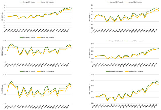 The monitored satellite indices in the grape orchard between 24 May 2021, before the biostimulant application, and 31 October 2021, at the end of the agricultural season, are reported in Figure 10. Although not significant, the vegetation, chlorophyll, and N status (CIRE, SAVI, EVI2, NDVI, NDRE1, and NDRE2) showed a slightly higher rate in the treated plots than in the untreated. After the third biostimulant application, the differences between the two treatments were more evident in September. The indices’ time-series means and standard deviations confirmed this trend (Figure 11 and Figure 12).