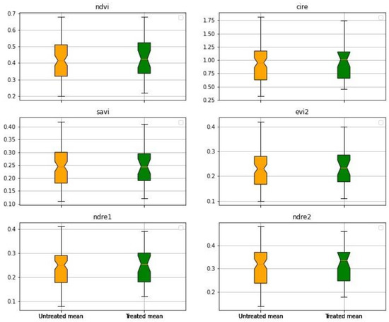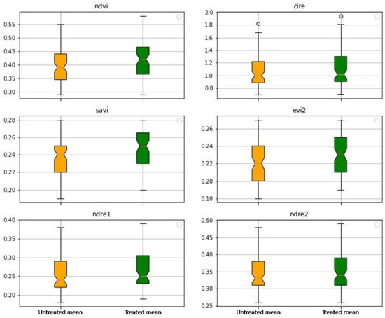 In Figure 3, the monitored satellite indices between 24 May 2021, before the biostimulant application, and 31 October 2021, at the end of the agricultural season, are reported. Olive plants’ vegetation, chlorophyll, and N status (CIRE, SAVI, EVI2, NDVI, NDRE1, and NDRE2) showed a net increase in the treated plots compared to the untreated plots. The difference in indices’ time-series means and standard deviations confirmed this increase (Figure 4 and Figure 5), yet it was not statistically significant.