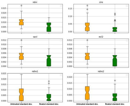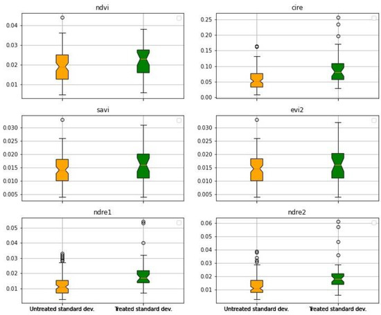 Satellite indices time-series standard deviation comparison on treated and untreated grape plots.