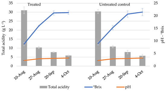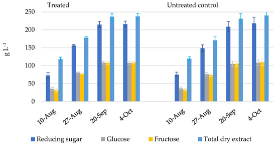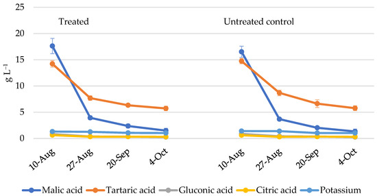 All variables related to the quality of grape pulp, determined in the four investigations carried out from fruit set to berry ripening, did not show any statistically significant difference (Figure 6, Figure 7, Figure 8 and Figure 9). In particular, at harvest, the content of reducing sugars, glucose, fructose, and total dry extract (Figure 6) was, on average, 217, 108, 109. and 239 g L−1, respectively. In any case, fifteen days before harvesting (at 20 September 2021), the values of these variables were similar to those recorded at harvest in the treatment with the biostimulant. In contrast, in the control, they tended to increase. This behaviour was also confirmed by the °Brix values (Figure 4) that increased in the last fifteen days before harvesting by 3% in the untreated control. In contrast, it remained almost unchanged (+0.6%) in the biostimulant treatment. In addition, pH value, total acidity, malic, tartaric gluconic and citric acid, and potassium content were similar in both treatments and during the ripening of the berries (Figure 7, Figure 8 and Figure 9).
