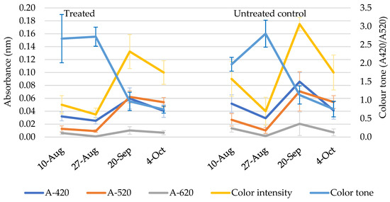 The grape juice obtained from each sample (4 samples per treatment) was filtered and subjected to multiparametric analysis through the FT-IR chemometric technique using the WineScan Flex instrument (FOSS, Hilleroed, Denmark). The following parameters were determined: reducing sugars (g L−1); glucose (g L−1); fructose (g L−1); sugar degree (°Bx); pH, total acidity (g L−1), volatile acidity (g L−1); total dry extract (g L−1); malic acid (g L−1); tartaric acid (g L−1); gluconic acid (g L−1); citric acid (g L−1); potassium (g L−1); absorbance at 420 nm (A420), 520 nm (A520), 620 nm (A620); and colour tone (A420/A520).