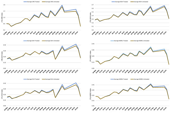 Satellite indices time-series mean comparison on treated and untreated grape plots.