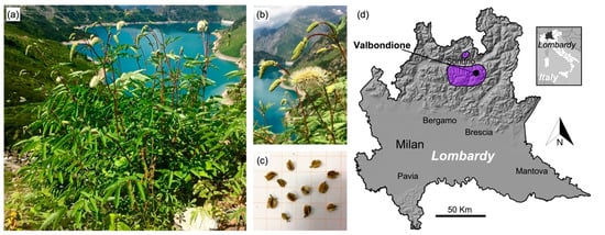 S. dodecandra is an acidophilous species with an uncommon abundance for an endemic species [3], and it is often dominant in the plant communities in which it grows. This species is considered “Near Threatened—NT” according to the IUCN Red List of threatened species [9]. S. dodecandra grows in disparate environments all characterized by high edaphic and/or air humidity: In avalanches gullies, nearby alpine streams and lakes, over dripping rocks/debris, and humid meadows and pastures [10,11,12], in an elevation range between 1000 and 2300 m a.s.l. [5]. However, different studies stated that this species can find its optimum in the Cirsio-Sanguisorbetum dodecandrae (Adenostylion alliariae alliance, Adenostyletalia order, Mulgedio alpini-Aconitetea variegati phytosociological class), especially concerning Valtellina [10,12,13].