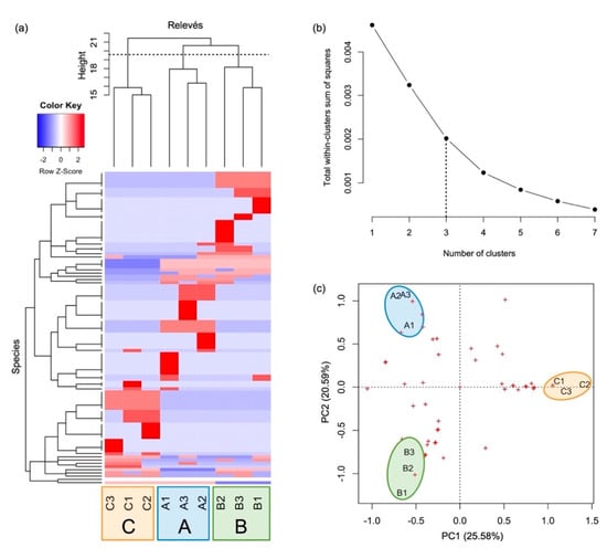 Hierarchical clustering heatmap and dendrogram of relevés (a) (capital letters indicate the sampling area where the relevés were carried out), distribution of total within-clusters sum of squares by number of relevé groups distinguished via hierarchical clustering (b) and PCA biplot of relevés (the red crosses are the species) (c).