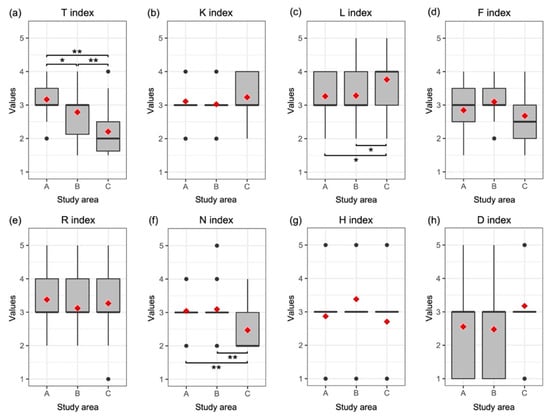 Ecological indexes of Landolt et al. [26]: Index of temperature—T (a); continentality—K (b); light intensity—L (c); soil moisture—F (d); substrate reaction—R (e); nutrients—N (f); humus—H (g); aeration—D (h). For each boxplot, the mean (red square) and median (black line) are highlighted. The asterisks show statistically significant differences: *, p < 0.05; **, p < 0.01.
