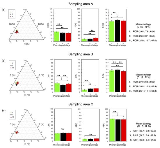 CSR triangular plots and histograms of the leaf samples of S. dodecandra collected in the three sampling areas (a–c) at different phenological stages: I, pre-flowering; II, flowering; III, post-flowering. The mean strategy was shown for each phenological stage of each sampling area. The asterisks indicate statistically significant differences: *, p < 0.05; **, p < 0.01; ns, not significant.
