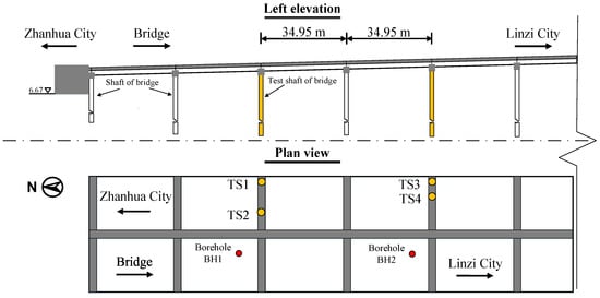 The highway from Zhanhua City to Linzi City in Shandong Province, China, has a total length of 108.697 km and required the construction of 73 bridges. This project is a simple beam bridge across the Delongyan Railway, located in Liangcai Township, Binzhou City, Shandong Province. Its length is 1262.2 m and its width is 30 m. The bridge of this project is based on large-diameter bored piles. The bridge for this project is based on large-diameter drilled shafts. Figure 1 depicts the plane and left profile of the bridge at the test site section. The route passes through the alluvial plain of the Yellow River. The soil layers in this area are mainly silty soil and silty sand.