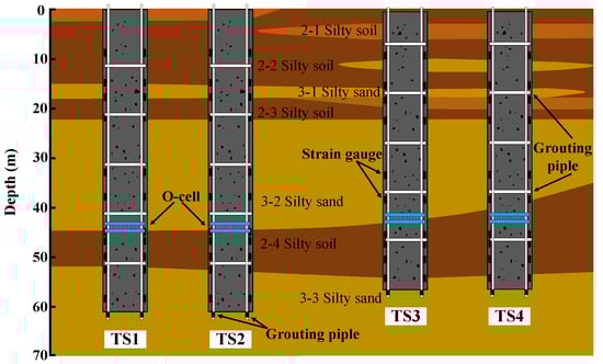 In order to enhance the bearing capacity of drilled shafts and reduce the settlement of shaft heads, combined tip and side grouting was adopted. In order to verify the improvement effect of combined grouting and determine the performance of drilled shafts, four test drilled shafts were selected for static load test verification. The diameter of all test piles was 1.8 m, the length of TS1 and TS2 was 61 m, and the length of TS3 and TS4 was 57 m. Following the completion of the drilling operation, ultrasonic equipment was used to assess the quality of the shaft completion. The detailed data of the drilled shaft is shown in Table 2. The elastic modulus of the concrete for the four test drilled shafts was 31 GPa.