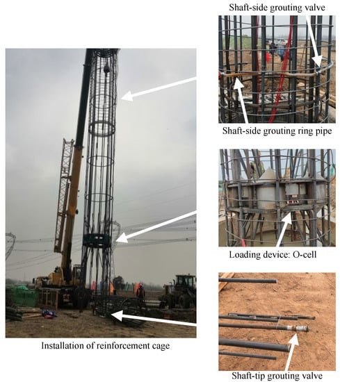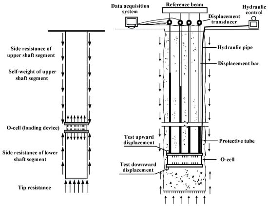 All test shafts were tested by the field bi-directional static test, which is the new method for bearing capacity detection in drilled shafts. In 1969, Nakayama and Fujiseki put forward the concept of testing the bearing capacity of the drilled shafts by the mutual reaction of shaft side resistance and shaft tip resistance, also known as the shaft tip loading test method [39]. Subsequently, Osterberg [40] applied this technology to engineering practice, so this loading method was also called the Osterberg-Cell load test or O-cell load test. Figure 4 depicts the typical bi-directional static test setting and loading principle. The O-cell was installed 17 m above the pile tip for TS1 and TS2, and 15 m above the pile tip for TS2 and TS3.The first bi-directional static test was performed 28 days after the drilled shafts were poured, and the combined grouting operation followed the first bi-directional static test. The second bi-directional static test was conducted 40 days after the completion of the combined grouting operation [21,31]. In order to monitor the axial strain and load transfer along the test shafts in the tests, the strain sensors were fixed on the vertical reinforcement along the entire test shafts. The specific installation positions of the strain sensors and the loading device are shown in Figure 2. When the bi-directional static test began, the hydraulic control system on the ground was pressurized, and the O-cell (loading device) applied loads to the upper and lower sections of the drilled shafts via hydraulic action. Two displacement transducers were installed at the top and bottom of the O-cell, and four displacement transducers were arranged at the head of the test shaft. These displacement transducers were used to record the displacement data during the loading. The test employs the slow maintenance load method, and the loading (unloading) procedure followed to Chinese standards [41].