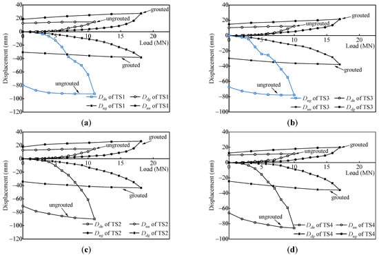 According to the Chinese standard [41], the load–settlement curves obtained by the bi-directional static test were converted to the equivalent Q-s curves of the conventional shaft head loading test, where the Q is the shaft head load and the s is the shaft head settlement. The Q-s curves of four test shafts are shown in Figure 6. In Figure 6a, the ultimate bearing capacity of TS1 and TS2 before grouting was 22,428 kN, and the corresponding shaft head settlement was 73.21 mm and 70.47 mm, respectively. After grouting, the ultimate bearing capacity of TS1 and TS2 increased to 38,561 kN, while shaft head settlement decreased to 54.73 mm and 59.85 mm, respectively. In Figure 6b, the ultimate bearing capacity of TS3 and TS4 before grouting was 20,196 kN, and the corresponding shaft head settlement was 67.15 mm and 62.66 mm, respectively. After grouting, the ultimate bearing capacity of TS3 and TS4 increased to 36,019 kN, while shaft head settlement decreased to 50.50 mm and 52.43 mm, respectively.
