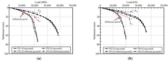 The tip sediment thicknesses of TS1 and TS3 were 42 mm and 53 mm, respectively, according to Table 2, while the tip sediment thicknesses of TS2 and TS4 were 29 mm and 25 mm, respectively. Before grouting, the difference in shaft tip sediment thickness was the main reason that the load–settlement curves of the lower segments of TS1 and TS3 were different from those of TS2 and TS4. Because of the thick and compressible sediment under the tips of TS1 and TS3, the soil strength beneath the tips of TS1 and TS3 was low, resulting in a sudden increase in the settlement of the lower segments of TS1 and TS3 under a certain level of load due to sediment compression.