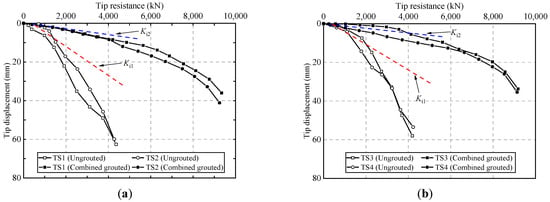 Before grouting, the ultimate tip resistance of TS1–TS4 was approximately 4188–4367 kN, and the corresponding tip displacement was approximately 53.5–62.6 mm (2.97D%–3.48D%); D is the diameter. After grouting, the ultimate tip resistance of TS1–TS4 was approximately 9130–9340 kN, representing a 116% increase; the corresponding tip displacement was approximately 33.8–41.1 mm (1.88D%–2.28D%), representing a 37% reduction. The average initial stiffness of the q–w curves of, TS1–TS4 was about 266 kN mm−1 before grouting, while the average initial stiffness of the q–w curves of, TS1–TS4 was 794 mm−1 after grouting, a 198% increase.