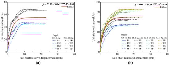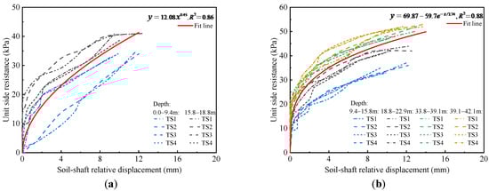 The load transfer curves τ-s of the side resistance at different depths were obtained by the field test, where τ represents the unit side resistance, and s represents the relative soil-shaft displacement. Figure 8, Figure 9, Figure 10 and Figure 11 show τ-s curves of TS1–TS4 in each soil layer before and after grouting. In Figure 8, Figure 9, Figure 10 and Figure 11, the fitting lines of τ-sτ-s curves of each soil layer are used to analyze and intuitively reveal the change trend of τ-s curves. The τ-s curves of silty soil and silty sand in the upper segments of TS1–TS4 before grouting are shown in Figure 8a,b, respectively.