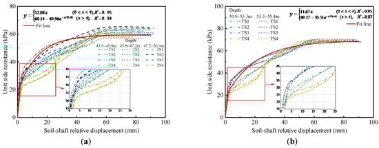 As shown in Figure 8a, the unit side resistance of silty soil gradually increases as the soil-shaft relative displacement increases. The τ-s curves exhibit linear elastic change at the beginning of loading followed by nonlinear elastic-plastic change. Note that the τ-s curves exhibit linear hardening behavior again at the later stage of loading, and no obvious softening failure occurs. This was similar to the static load test results of piles performed by Yu et al. [42] in the Taipei gravel layer. Because the construction-effect and shaft tip sediment softened the side resistance and tip resistance of the lower shaft segments, the bearing capacity of the lower segments is less than that of the upper segments. At the end of loading, the lower shaft segment that provides the loading reaction failed first, preventing the upper shaft segment from being loaded to failure further.
