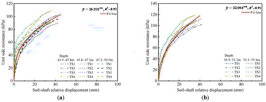 It was worth noting that the τ-s curves of the lower segment of TS3 were significantly different from those of other test shafts, with a more serious and obvious side resistance softening-effect after the end of its linear elastic stage (red circles in Figure 10a,b). This was due to a thick layer of sediment beneath the tip of TS3. As the load increased, the sediment beneath the tip begins to bear the load, but its stiffness was very low. Therefore, the τ-s curves of the lower segment of TS3 appeared to have an obvious side resistance softening-effect at the early stage of loading. When the soil-shaft relative displacement reached about 23 mm (1.27D%), the τ-s curves of the lower segment of TS3 reverted to an obvious side resistance reinforcing-effect, though the period of this resistance reinforcing stage was brief. This was because after the shaft tip sediment was completely compressed, the shaft tip resistance effectively improved, helping the shaft side resistance to be mobilized again. When the soil-shaft relative displacement reached about 26 mm (1.44D%), the τ-s curves of TS3 exhibited similar behavior to other test shafts again.