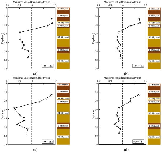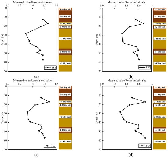 Ratio of measured value/recommended value of ultimate side resistance distributed with depth after grouting: (a) TS1; (b) TS2; (c) TS3; (d) TS4.
