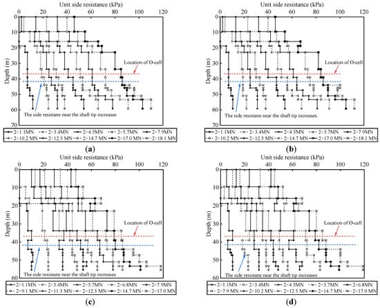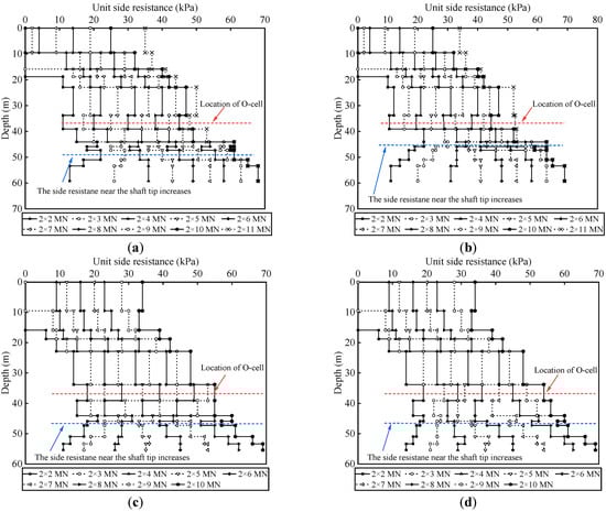 Figure 14 depicts the distribution of side resistance versus depth of TS1–TS4 under various loads before grouting. Under low load, the side resistance of the soil layer with an embedded depth of 45–61 m decreased with depth, which was most noticeable in the TS2 and TS3. This phenomenon, however, changed as the load increased. When the load reached a certain level, the side resistance of the soil layer with an embedded depth of 45–61 m (near the shaft tip) changed to increase with depth. This side resistance reinforcing-effect was more noticeable under high-level load.