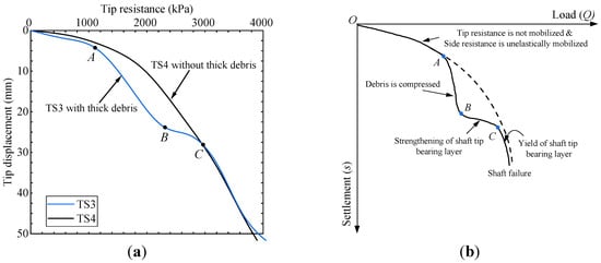 The TS3 and TS4 of the same size were compared and analyzed to better explain the mechanism of the side resistance softening-effect and reinforcing-effect. Figure 16a depicts the q-w curves of TS3 and TS4 when the shaft tip loading range was 0–4000 kN. When compared with TS4, we found that the tip resistance of TS3 was first softened and then reinforced during loading. TS3 had thick sediment under the shaft tip, while TS4 did not.