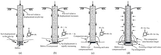 As shown in Figure 17c, after the shaft tip sediment was completely compressed, the shaft tip resistance began to be mobilized. The soil layer below the shaft tip level was compressed in a specific range, and the soil layer below the shaft tip level moved upward. The stress arching phenomenon occurred in the soil near the shaft tip [44,45,46], where the arching zone and the compaction zone appeared, and the radial effective stress increased to σh + Δh. The compaction and reinforcing effect were gradually increased from top to bottom. The radial effective stress σh + Δh increased the most near the shaft tip, and the side resistance reinforcing-effect was most visible.