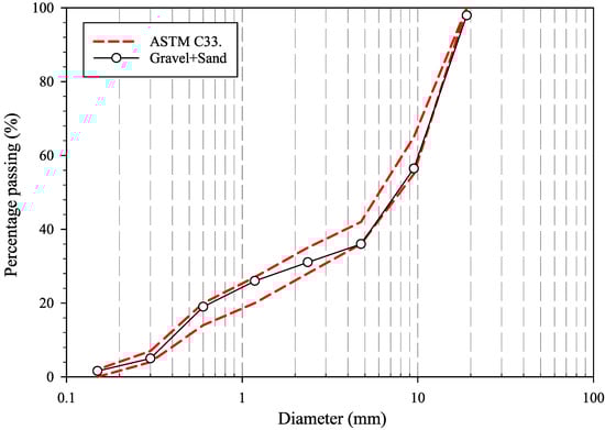 The aggregate materials used in this study consisted of coarse and fine aggregates. The coarse aggregate was crushed limestone collected from a stone mill factory in Pak Chong District, Nakhon Ratchasima Province, Thailand. The maximum size, water absorption, and specific gravity of the coarse aggregate were 19 mm, 0.43%, and 2.70, respectively [32,33]. River sand with a specific gravity of 2.60 was used as the fine aggregate [34]. The maximum size and water absorption of the fine aggregate were 4.75 mm and 0.47%, respectively [32]. The particle size distribution of the aggregate materials is shown in Figure 1. The particle sizes of the aggregate material samples were prepared according to ASTM C33 [35].