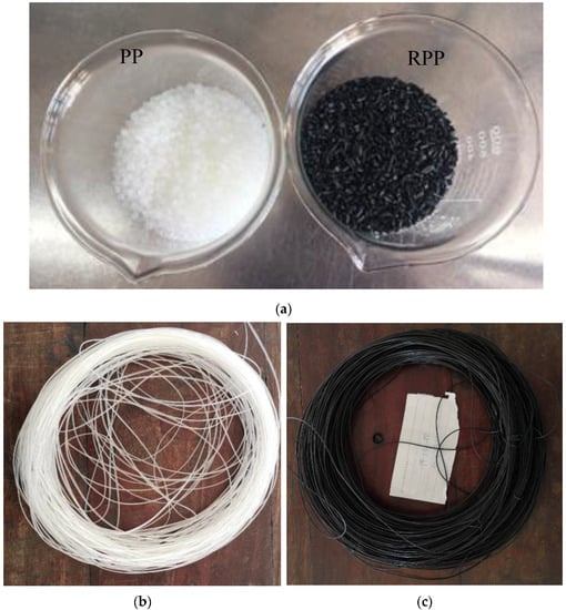 The PP and RPP pellets were obtained from IRPC Public Co., Ltd. (Rayong, Thailand) and Thai Rung Rueang Plastic Co., Ltd. (Samut Prakan, Thailand), respectively, as shown in Figure 2a. In this study, the fibers at PP:RPP ratios of 100:0, 75:25, 50:50, 25:75, and 0:100 were mixed and extruded at a temperature of 315 °C and a stretching temperature of 140–170 °C. The fiber specimens at PP:RPP ratios of 100:0 and 0:100 are shown in Figure 2b,c, respectively. The density of the fibers was 0.90–0.95 g/cm3. The fibers had a nominal diameter of 2 ± 0.1 mm. The fibers were cut into pieces 50 mm in length. The tensile properties of the plastics were evaluated according to ASTM D638-14 [36].