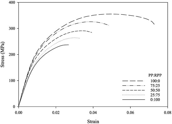 Figure 3 indicates the relationships between stress and strain for F at PP:RPP ratios of 100:0, 75:25, 50:50, 25:75, and 0:100. The stress value of F increased as the strain increased up to the maximum value and beyond, and the stress tended to drop for all PP:RPP ratios. The maximum stress value of F was found at a PP:RPP ratio of 100:0, whereas the minimum stress value of F was found at a PP:RPP ratio of 0:100. The stress values of F at PP:RPP ratios of 100:0, 75:25, 50:50, 25:75, and 0:100 were 354, 325, 290, 265, and 225 MPa at maximum strain values of 0.055, 0.045, 0.038, 0.03, and 0.028, respectively. Similar trends were also reported by Yin [28], who concluded that F prepared with a PP:RPP ratio of 100:0 exhibited a 33% higher tensile strength than F prepared with a PP:RPP ratio of 0:100. Moreover, Yin et al. [30] showed that the tensile strength of F prepared with a PP:RPP ratio of 100:0 was up to 25% lower than that of the F mixed with a PP:RPP ratio of 0:100. This is due to the addition of RPP in the specimens led to a lower molecular weight and shorter molecular chains as a result of higher crystallinity and different crystal sizes [29,30].
