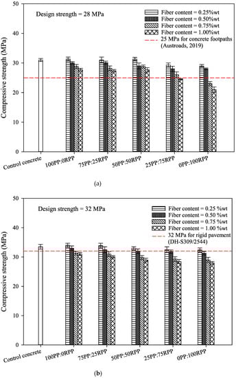 - All mixtures met the compressive strength requirements for concrete footpaths, except for those with F contents of 0.75 and 1% and a PP:RPP ratio of 0:100. Meanwhile, the 32 MPa FRC sample with F contents of 0.25 and 0.5% for all PP:RPP ratios met the minimum requirements for rigid pavement.