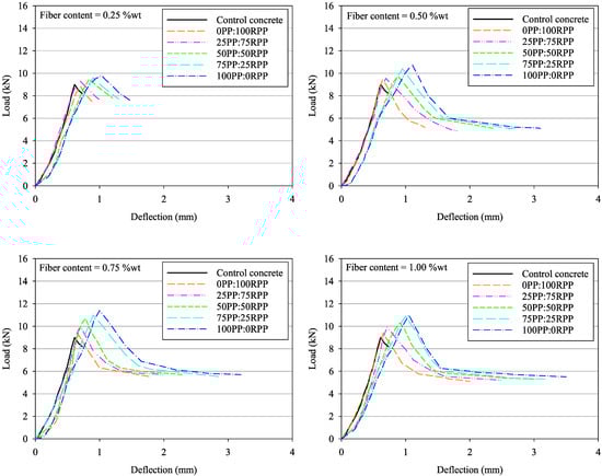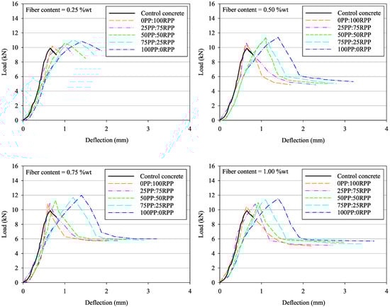 Relationship between load and deflection of 28 MPa FRC at different F contents and PP:RPP ratios.