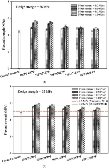 At a particular F content, the flexural strength of the 28 and 32 MPa FRC samples decreased with PP:RPP ratios ranging from 100:0 to 0:100 due to the reduced tensile strength of the fiber. This was associated with a decrease in compressive strength. The flexural strength requirements for rigid pavement specified by Austroads [41] and the Department of Highways, Thailand [42] were at least 4.5 and 4.2 MPa, respectively. All 32 MPa FRC mixtures met Thailand’s criterion [42], whereas the 32 MPa FRC samples with F contents of 0.25 and 0.5% at all PP:RPP ratios met the requirement specified by Austroads [41].