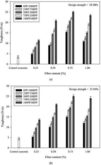 - The maximum compressive strengths of 28 and 32 MPa FRC, 31.3 and 34 MPa, respectively, were found at a fiber content of 0.25% and a PP:RPP ratio of 100:0, whereas, the maximum flexural strength and toughness of the 28 and 32 MPa FRC samples were found at an optimum F content of 0.75% for all PP:RPP ratios.