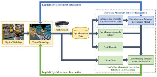 With the constant exploration and development of intelligent manufacturing, the concept of digital twins has been proposed and applied. In view of the complexity and intellectualization of virtual workshop systems, real workshops can link with virtual workshosp based on AR under the structure of digital twins, which allows users to interact with virtual information and perceive the virtual information superimposed on the real world with great immersion. However, the three-dimensionality of virtual workshops and interaction with complex workshop information can be challenging for users. Due to a shortage of input bandwidth and the nontraditional mode of interaction, a more natural interaction technique for virtual workshops is required. To solve such problems, this paper presents a technical framework for 3D eye movement interaction applied to a virtual workshop. An eye movement interaction technique, oriented to implicit interaction and explicit interaction, is developed by establishing behavior recognition and interaction intention understanding. An eye-movement experiment verifies the former’s accuracy is above 90% and had better recognition performance. A better feature vector group of the latter is selected to establish a model and verify its feasibility and effectiveness. Finally, the feasibility of the framework is verified through the development of an application example.