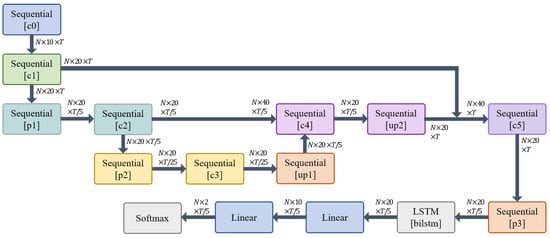 The input dimension of the model is , where N is the batch size, T is the number of time points and 2 is the dimension of eye movement velocity calculated by the first-order difference of eye movement point coordinates. CNN can effectively extract the spatial characteristics of data, and Bi-LSTM can efficaciously capture the context information and extract the time properties of data. Therefore, the feature vector output by CNN is used as the input of Bi-LSTM. Then, the classifier is used for feature classification after passing through the fully connected layer. The CNN and Bi-LSTM hybrid neural network integrates the advantages of CNN and Bi-LSTM. Its structure is shown in Figure 2.
