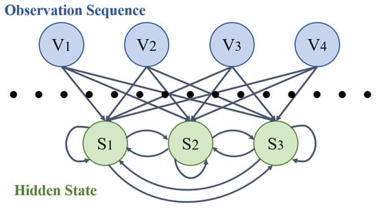 HMM is a statistical probability model of time series based on Bayesian theory, which is put forward on the basis of the Markov model. It is used to describe the double stochastic process of the transition and performance of the recessive state of a system [24]. Figure 4 shows the graph structure of HMM. HMM which has the advantages of rigorous structure and reliable results can represent invisible and unmeasured states, so it is often used as an intention recognition model for time-based continuous series data. It is usually described by parameter , which is determined by initial probability distribution , state transition probability distribution A and observation probability distribution B, and its expression is . The hidden Markov chain is determined by a state transition probability matrix and initial probability vector. Then, the unobservable state sequence is generated and the observed sequence is determined by the probability matrix and state sequence.