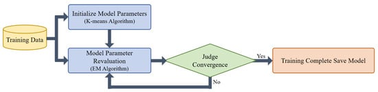 The data obtained in this paper come from the interactive process between users and a virtual workshop system, so the observation sequence is a continuous sequence based on time. Therefore, the continuous HMM is selected to establish the model to avoid the data distortion caused by data quantization caused by vector quantization of the observation sequence in an application. GMM models the feature distribution described by each state of HMM, and it can simulate any curve smoothly and approximately through multiple Gaussian distributions [25], so a Gaussian mixture model is chosen to describe the distribution of observation probability. Then, the GMM-HMM model is constructed. Compared with HMM, it doesn’t need a lot of training data and has better modeling ability and recognition accuracy [26].