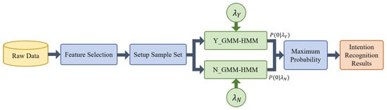 The combination of these six characteristic variables and the revaluation formula of model parameters are used to train the corresponding models with and without interaction intention. The transition sequence of the interaction state when users are in the virtual workshop scene is hidden in this paper, so there are two types of user interaction state sets S, namely, hidden state sets , where = {interactive intention state} and = {non-interactive intention state}, and the implicit state and Gaussian mixture number of the two intention models are set to 2. The model training process is shown in Figure 5. After finishing model training, the convergent intention model of each combination of characteristic variables calculated by EM algorithm can be obtained. During model testing and practical application, the output probability of the selected model is taken as the recognition result, and the model with the highest probability is selected as the current user interaction intention, in which Y_GMM-HMM and N_GMM-HMM are interactive and non-interactive intention models, respectively. Recognition by the GMM-HMM model is shown in Figure 6.