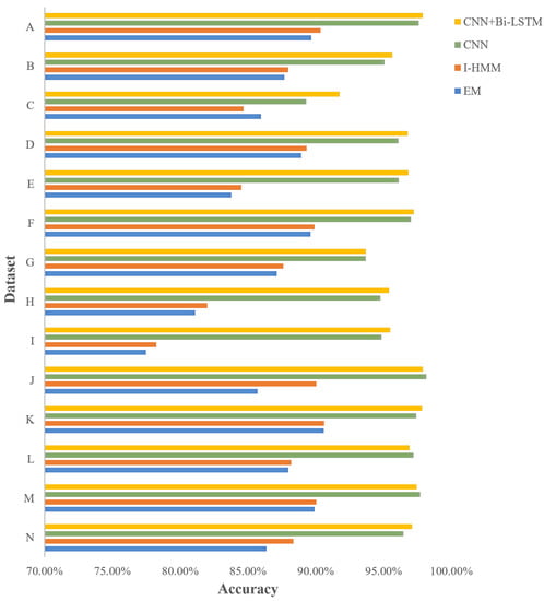 In this paper, commonly used indexes for evaluating the performance of a model are adopted, including accuracy, Kappa coefficient and F1 score. The eye movement data mentioned above are used to train and verify the eye movement behavior recognition model. The accuracy results of each model in the test set of each dataset are shown in Figure 7. The comparison results of the models based on Kappa coefficient, F1 parameter and running time are shown in Table 2.