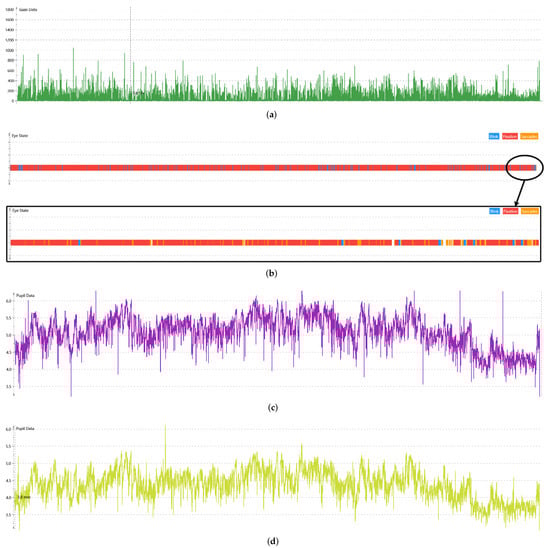 “User’s eye movement characteristics + User’s eye movement state + User’s mental state” feature variables. (a) Eye movement angular velocity. (b) User’s eye movement state: red, fixation; yellow, saccade; blue, blink. (c) Diameter of left pupil. (d) Diameter of right pupil.