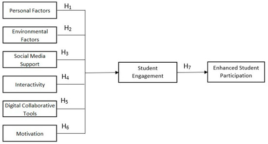 Based on the literature that has been discussed, the following constructs in Table 2 were derived. The research aims to look into the role of personal factors, environmental factors, social media support, interactivity, digital collaborative tools, and motivation in increasing student engagement, which in turn enhances student participation. Figure 1 depicts the research model of this study.