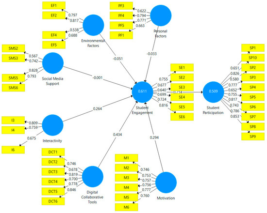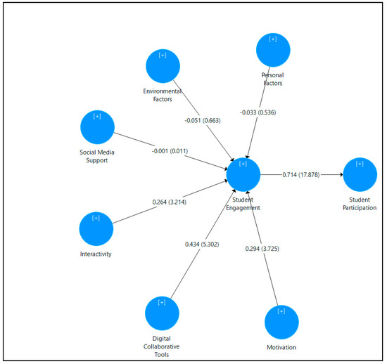 A structural model evaluation was conducted in order to determine whether the hypotheses of the study are supported by the data attained from the analysis. Figure 3 depicts the structural model that was derived from SmartPLS 3 after conducting a non-parametric bootstrapping with a sample of 5000. The coefficient of determination (R2) values for this were 0.611 and 0.509, which fall under the moderate category. This means that 61.1% of the total variance in student engagement was explained by personal factors, environmental factors, social media support, interactivity, digital collaborative tools, and motivation. Additionally, 50.9% of the total variance in student participation was explained by student engagement.