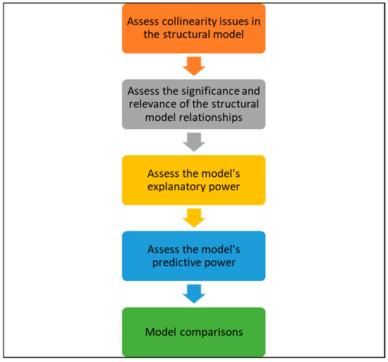 Based on Hair et al. [101], assessment of a structural model was conducted as per the steps in Figure 3 below. First, the model had to be assessed for potential collinearity issues. The rationale for this is that ordinary least squares (OLS) regressions of each endogenous construct on its corresponding predictor constructs are used to estimate path coefficients in structural models. The collinearity analysis is outlined in Table 8 below, wherein the variance inflation factor (VIF) values were below 3, therefore indicating that the constructs had no multicollinearity issues.