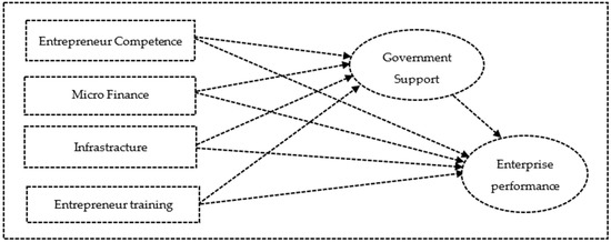 Moreover, this study used the mediator variable government support to identify the direct and indirect effects of the entire variable adopted from previous findings [97]. Therefore, the study used four independent variables such as entrepreneurial competence, microfinance, access to infrastructure, and entrepreneur training concerning the dependent variable enterprise performance.