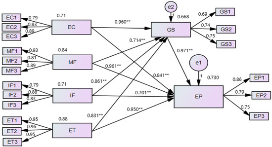 The correlation matrix analysis results incorporated the inter-correlations of the primary study variables such as EP, EC, MF, IF, ET, and GS, respectively. As a result, indicates, there is a significant impact with a positive correlation at r = 0.656 **, and p < 0.01 between EC and EP. Furthermore, there is also a significant influence with a positive correlation at r = 0.844 **, p < 0.01 between MF and EP. The intercorrelations are also significant effects with a positive association between MF and EC at r = 0.837 **, p < 0.01. So that, there is a higher magnitude of correlation with the outcome variable enterprise performance (EP). The relationship between IF and EP is positive and significant at r = 0.635 **, p < 0.01 as well as between IF and EC has significant and positive integrity at r = 0.845 **, p < 0.01. Likewise, there is also the same significant effect with a positive relationship that exists entirely between IF and MF at r = 0.785 **, p < 0.01.