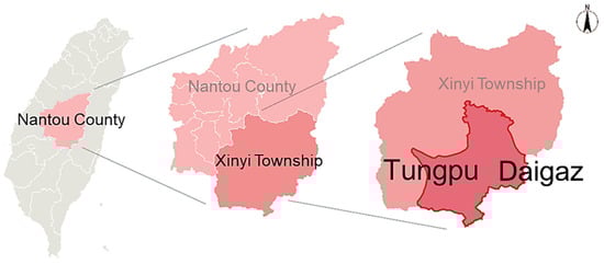 The selected site for the study, Tungpu Daigaz, is located in southern Nantou County. Nantou County lies at the geographical heart of Taiwan and is the only county that does not border the coast. Tungpu Daigaz, located where Chenyoulan River and Salisian River meet and 1100 m above the sea level, is one of the villages at the highest altitude in Xinyi Township (Figure 1).