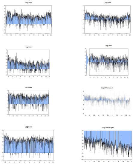 Clearly the commodity returns are especially volatile after 2020 with the novel coronavirus outbreak. The gold, silver and agriculture commodity returns display a similar volatility pattern, whereas the copper, lead and metals dynamics show no temporal pattern.