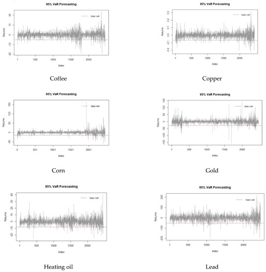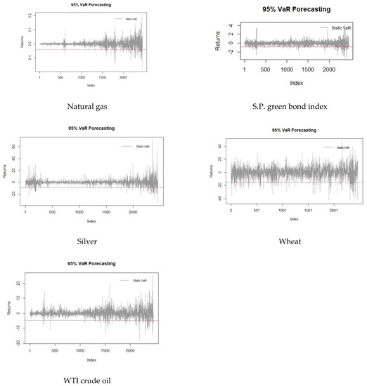 Figure 2 shows at value at risk (VaR) for the selected commodities and green bonds at 95% forecasting. The red line is VaR at a level of 95%. All the points below the red line are at risk at 95%. We can observe that fluctuation increases at the extreme right end for all the commodities and green bonds.
