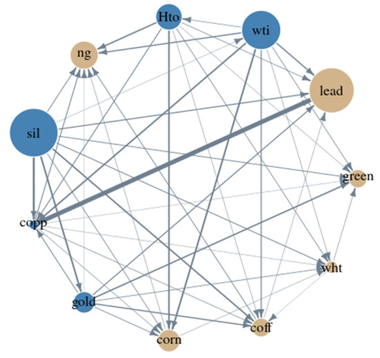 Figure 3 shows the network plot of green bonds and commodities. The figure clearly shows that the connectedness among various commodities and green bonds is very mild. Commodities with yellow nodes depict the effect of the net receiver of shocks, while commodities with blue nodes represent the effect of the net transmitter of shocks. The edges show the connectedness among the commodities and green bonds. Most of the commodities emerged as net receivers of shocks, which comprises of lead, green bonds, coffee, corn, wheat and natural gas, while silver, heating oil, WTI crude oil, copper and gold emerged as net transmitters of shocks. Further, lead and silver emerged as net receiver and transmitter of shocks, respectively. The connectedness was strongest between lead and copper. Lead receives shocks from WTI crude oil, heating oil, silver, gold, and coffee. Green bonds receive shocks from WTI crude oil, heating oil, silver, copper, gold, and wheat. Wheat receives shocks from WTI crude oil, heating oil, silver, copper, gold, and corn, while transmitting shocks to coffee. Coffee receives shocks from WTI crude oil, heating oil, natural gas, silver, copper, gold, and wheat, while transmitting shocks to lead. Corn receives shocks from heating oil, WTI crude oil, silver, copper, and gold, while transmitting shocks to natural gas. Natural gas receives shocks from silver, copper, gold, corn, coffee, WTI crude oil, and heating oil. On the other hand, gold is transmitting shocks to copper, lead, green bonds, wheat, coffee, and corn, while receiving shocks from silver. Copper is transmitting shocks to corn, coffee, natural gas, wheat and green bonds, while receiving shocks from gold, silver, heating oil and WTI crude oil. Heating oil is transmitting shocks to natural gas, copper, corn, coffee, wheat, green bonds, and lead, while receiving shocks from WTI crude oil. WTI crude oil is transmitting shocks to heating oil, natural gas, copper, corn, coffee, wheat, green bonds, and lead, while receiving shocks from silver. In other words, we can say that perishable commodities are receiving shocks from non-perishable commodities barring lead.